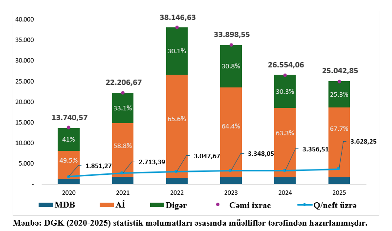 Son illərdə Azərbaycan Respublikasının xarici ticarət dövriyyəsi artmışdır. Belə ki, 2020-ci ildə 24,472 milyard dollar olan xarici ticarət 2025-ci ildə 49,423 milyard dolara çatmışdır ki, bu da iki dəfədən çox artım deməkdir. Eləcə də, ixracat həcmi bu dövrdə 13,741 milyard dollardan 25,043 milyarda (1,82 dəfə artım) yüksəlmişdir. 2022-ci ildə ixracat həcmi ən yüksək həcmə (38,147 milyard dollar) çatmışdır ki, bu da Avropa İttifaqına ixracın təxminən 2 dəfəyə yaxın artmasıyla (25 milyard dollarla) olmuşdur. İxracatı Avropa İttifaqı, MDB və digər ölkələr üzrə qruplaşdırsaq, görərik ki, Aİ payı (67,7%) çox yüksəkdir. Digər tərəfdən, qeyri-neft ixracatının həcmi 2020-ci ilə görə təxminən 2 dəfə artmışdır. Beləcə, qeyri-neft ixracatı həm məbləğ olaraq (3,6 milyard dollar), həm də ixracatda payı olaraq (14,5%) ən yüksək olmuşdur. Aşağıdakı Qrafikdə 2020-2025-ci illər üzrə ümumi ixrac, Aİ, MDB və digər ölkə qruplarını həcmi, payı, eləcə də qeyri/neft sektoru ixracatını görə bilərik.