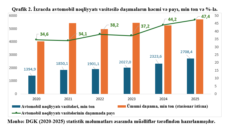 2025-ci ildə Azərbaycanın qeyri-neft ixracatı həm məbləğ olaraq (3,6 milyard dollar), həm də ixracatda payı olaraq (14,5%) son altı il üzrə ən yüksək olmuşdur. Avtomobil daşımalarının istifadəsinin ümumi ixracda payı (stasionar istisna) 2025-ci ildə 47,4%-ə çatmışdır. Məbləğ olaraq baxsaq, avtomobil daşımaları (stasionar daşımalar istisna olmaqla) ümumi ixracatın 62,6%-ni həyata keçirir. Belə ki, ixracın artırılması üçün bu daşımalarda qayda və şərtlərin optimallaşdırılmasına ehtiyac vardır.