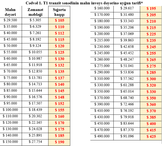 T1 sənədi tariflərinə nəzər yetirəndə görürük ki, hər 5,000 dollarlıq əlavə yükə görə 932 dollar təminat verilir. Belə ki, malın dəyəri 29,500 dollardan-100,000 dollara qədər olduqda, hər əlavə 5,000 dollarlıq yükə görə 932 dollar təminat verilir və sığorta haqqı hər pillədə 2-5 dollar artır. Malın dəyəri 100,000-200,000 dollar dəyərində yükə görə, hər əlavə 10,000 dollarlıq yükə görə zəmanət məbləği 1,863 dollar olur. Eləcə də, 200,000-300,000 dollar dəyərində malda yükdə hər əlavə 15,000 dollarlıq yükə görə 2,795 dollar və 300,000-490,000 dollar dəyərində malda yükdə hər əlavə 20,000 dollarlıq yükə görə 3,726 dollar zəmanət verilir. Sığorta haqqı da ümumi tarif üzrə, fərqli hesablamalar olmaqla birlikdə, əsasən 5,000-10,000 dollar dəyərində əlavə yükə görə 5-10 dollar, hər 15,000-20,000 dollarlıq əlavə dəyərə görə təxminən 10-15 dollar sığorta haqqı artır.